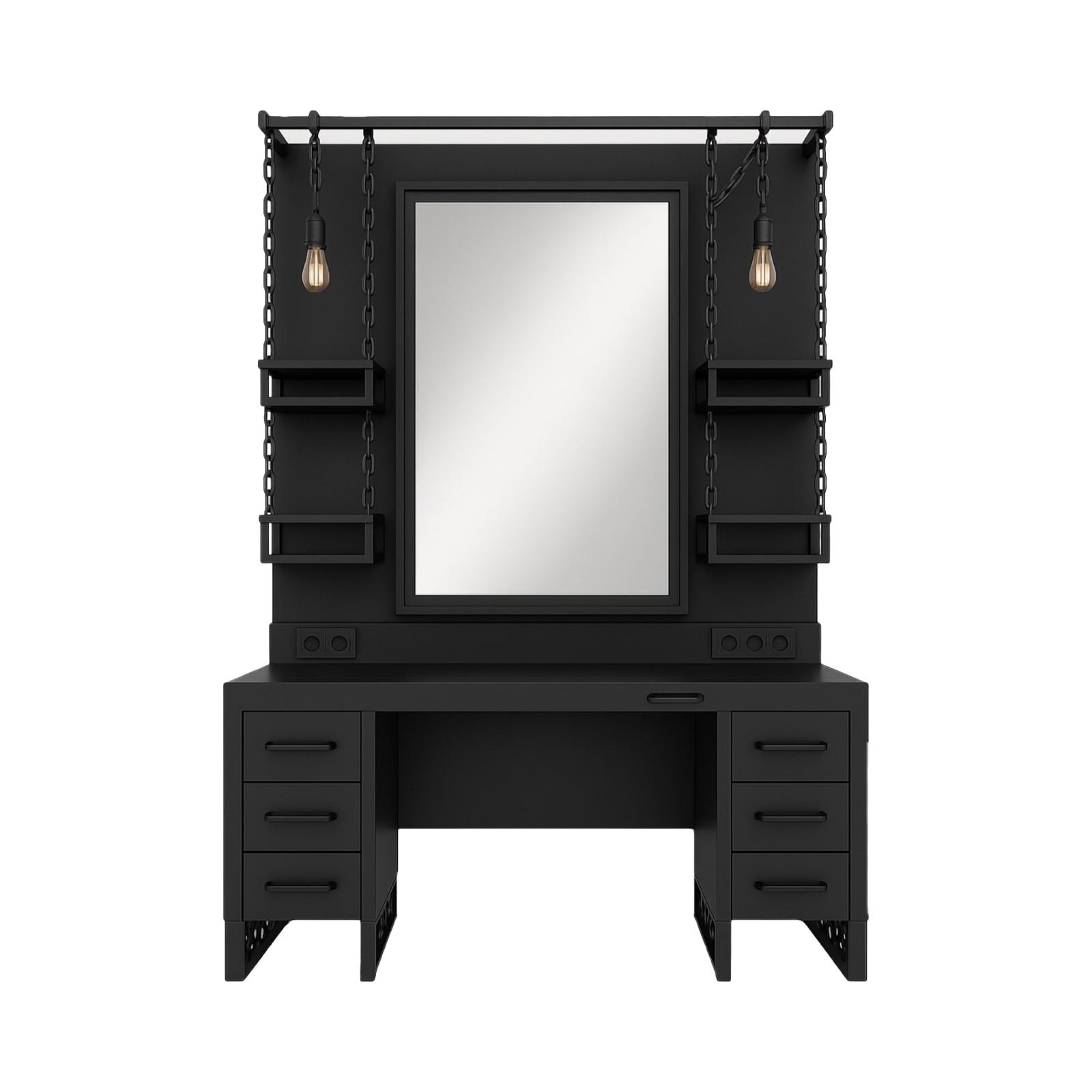 Command attention with the Industrial Noir Barber Station, designed for modern barbershops that value bold, functional design. This statement piece features a matte black finish, floating shelves suspended by industrial chains, and vintage Edison bulb lighting. With integrated power outlets and deep storage drawers, it’s built for professional efficiency with an edge.